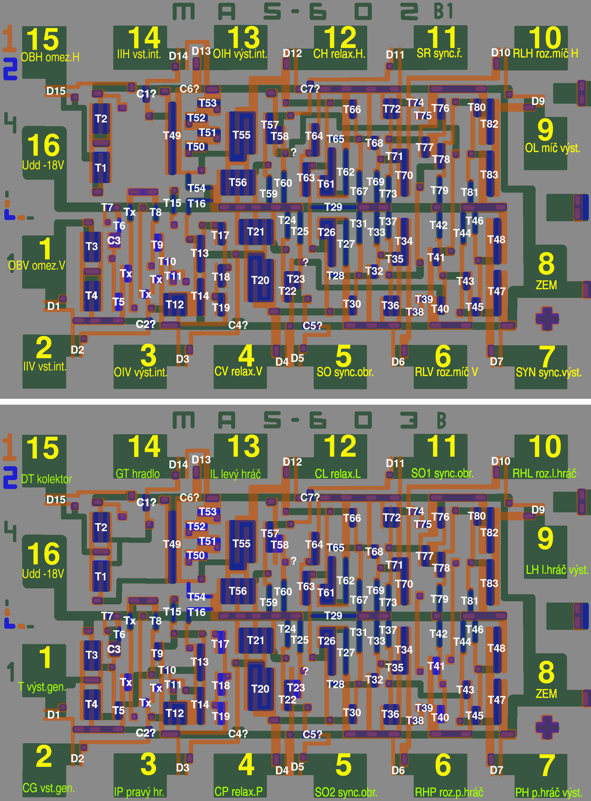 V minulém článku jsme si představili zvenku i zevnitř televizní hru XD-8001, kterou od roku 1979 vyráběla Piešťanská Tesla. Hra je založena na specializovaných čipech MAS601-603, navržených a vyráběných přímo v Piešťanech, což je v rámci tehdejšího východního bloku herní unikát, a i ve světovém měřítku vzácnost. Tento článek je určen pro obzvláště zvídavého a trpělivého čtenáře, neboť půjdeme ještě hlouběji: Nahlédneme přímo do vnitřní struktury zmíněných čipů a pokusíme se rozluštit jejich fungování. Zkusíme si také odpovědět na otázky ze závěru minulého článku: Proč rozdělení na 3 obvody? Proč napětí -18V? Proč je půlka hry analogová?
