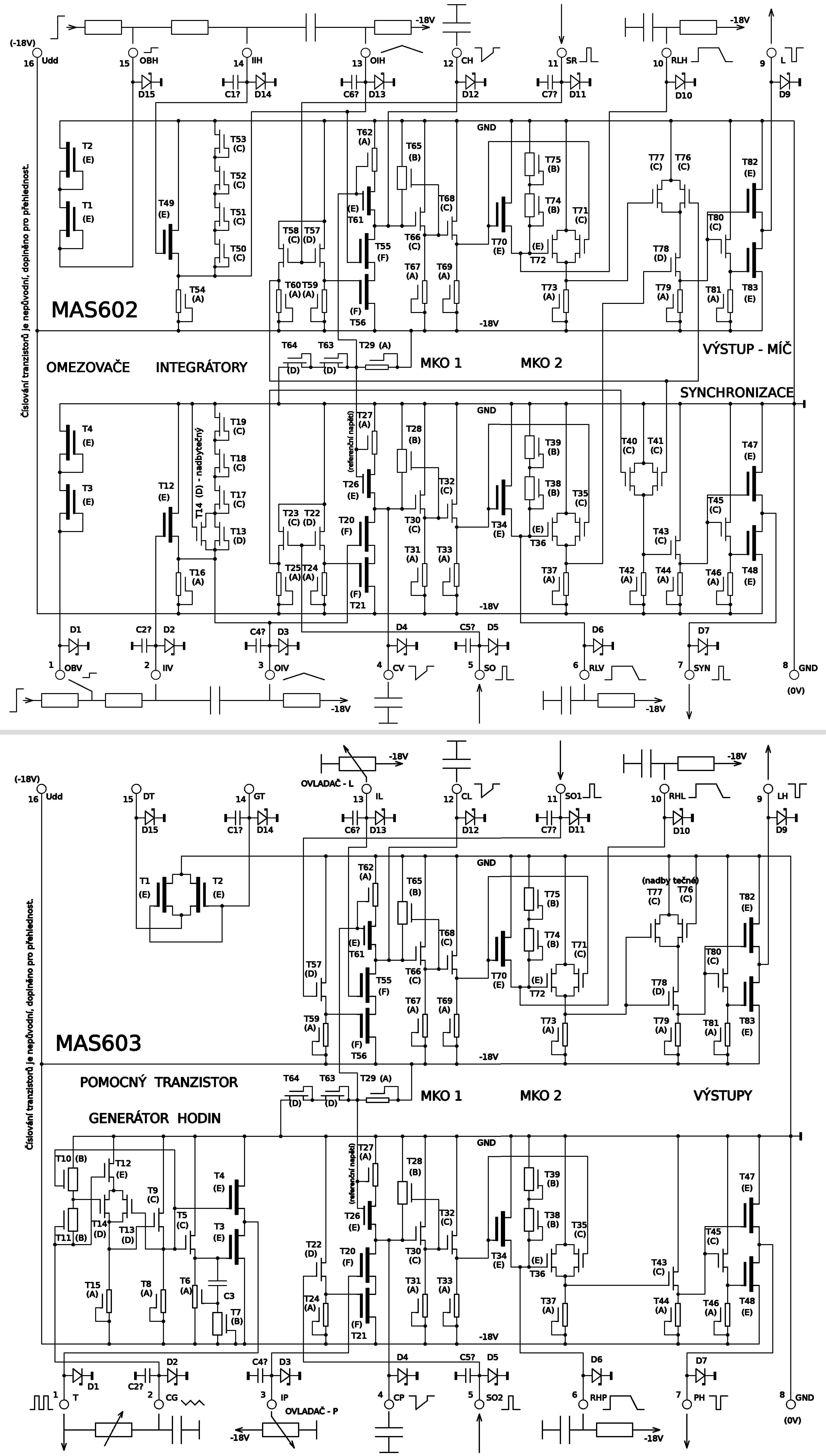 Druhý výstup (pin 7), který v případě MAS602 vlastně není potřeba, je využit ke sloučení horizontální a vertikální synchronizace pro televizor. Obvod MAS603 obsahuje dále generátor hodinového kmitočtu, ke kterému se vrátím až v příštím článku v souvislosti se změnami, kterými prošel, a také takzvaný "pomocný tranzistor", což je prostě jeden ze zbývajících tranzistorů společné základní struktury obou čipů, vyvedený na zbylé piny 14-15 (v přístroji není k ničemu použit). Zbylých tranzistorů je ovšem na čipech více, protože všechny tranzistory čipu MAS602 existují i na čipu MAS603 a naopak, jakožto vedlejší produkty zjednodušeného návrhu. Nadbytečné tranzistory většinou nejsou nikam připojeny, mnohé ani nemají hradlo, nebo jsou trvale zavřené a do funkce obvodu nijak nezasahují. Pro zajímavost jsem pár takových v překresleném schématu ponechal.
