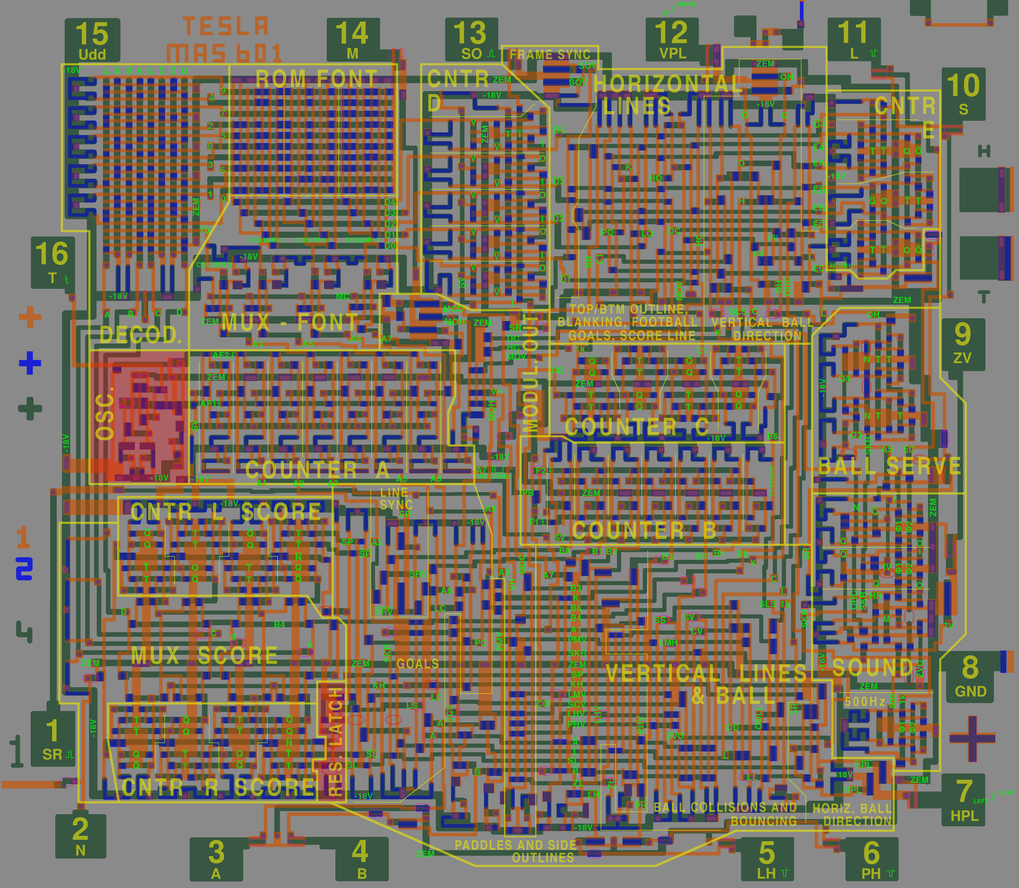 Tady se mimoděk dotýkáme otázek ze závěru minulého článku. Architektura celého systému dává mnohem větší smysl, jakmile si uvědomíme limity Tesly v sedmdesátých letech, kdy výroba unipolárních integrovaných obvodů teprve začínala. Zde použitá technologie MNOS stála někde u jejích začátků, byla původně zvolena především kvůli spolehlivosti při ne zcela ideální čistotě výroby, a v době vzniku MAS60x byla ještě prakticky jedinou volbou. Pro starší aplikace např. v ovládání televizorů (MAS560 atd.) se hodila dobře, ani poměrně velké záporné napájecí napětí nijak nevadilo, pro televizní hru však přece jen už byla určitým limitem rychlost (podle slov ing. Áče byl mezní kmitočet jen několik MHz). Hodinový kmitočet 875kHz použitý pro MAS601 poskytuje ve vodorovném směru rozlišení 39 pixelů, které by pro digitálně řešený pohyb míče zřejmě nebylo dostatečné. Uvážím-li navíc rozsah logiky potřebné pro takové řešení, a také velikost čipu, který jako by na úvodním obrázku již přetékal z podložky v pouzdře, nedivím se, že v části systému prozatím převážily výhody řešení typického pro starší analogové hry. S několika vnějšími součástkami a mnohem jednodušším obvodem se tak dosahuje skutečně plynulého, libovolně nastavitelného pohybu.