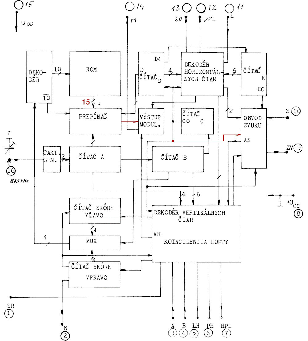 Obvody v levé dolní části obrázku řeší chování míče, jehož videosignál (L) je přiveden z obvodu MAS602. Trojice hradel nalevo detekuje souběh signálu (kolizi) míče s levými či pravými překážkami, a také vůči středové síti - tam ovšem jen s omezenou pravděpodobností, když síť (sama o sobě již děravá) je ještě znovu proděravěna přidáním signálu 1k. Signál CV při fotbalu potlačuje v začátku hry odrazy i zobrazení (ZL) míče, dokud je na obrazovce skóre (SKR) - tato podmínka má obecně význam pozastavené hry, a protože skóre zhasíná až při průchodu míče sítí, vzniká vlastně při fotbalu efekt výkopu ze středu hřiště.