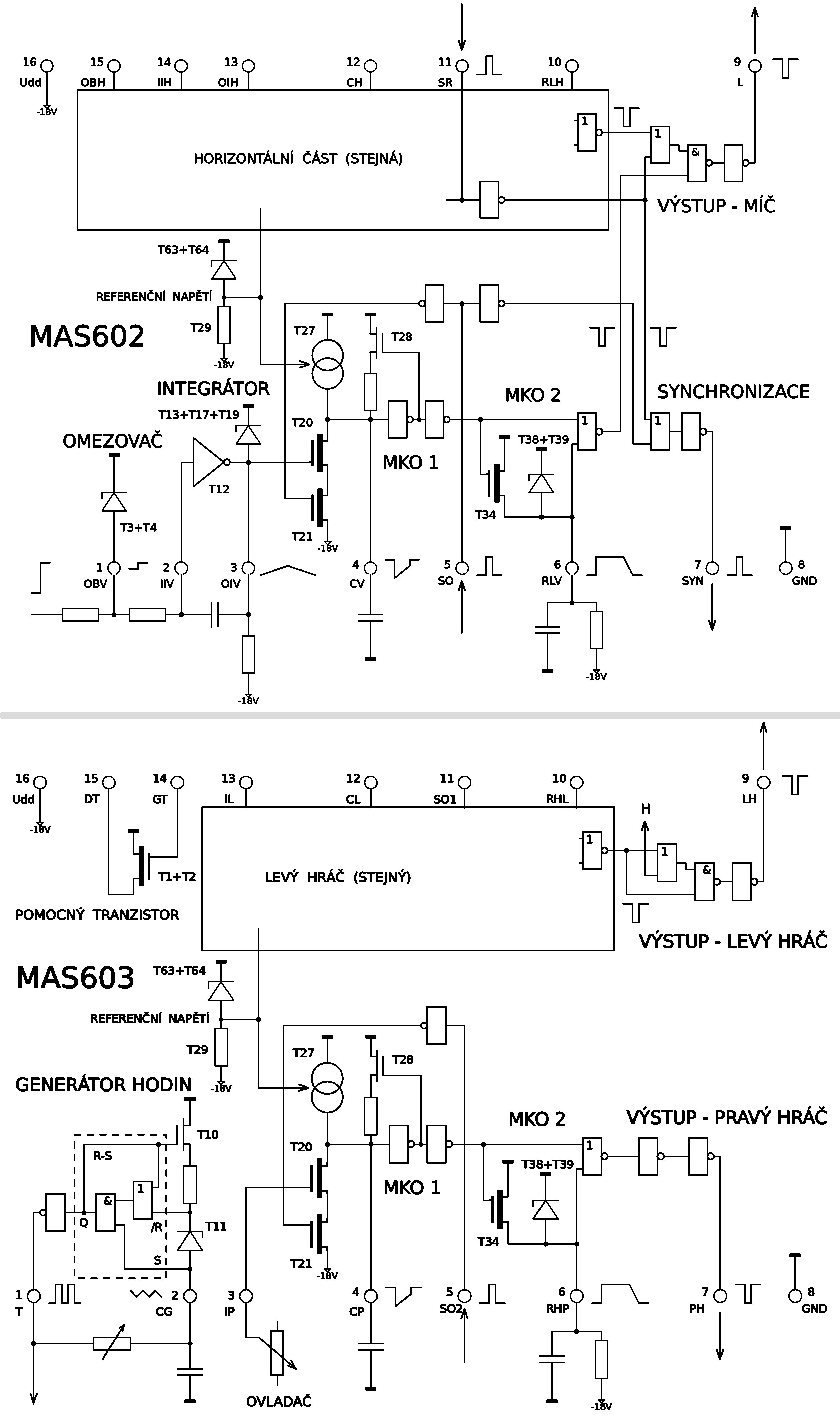 V minulém článku jsme si představili zvenku i zevnitř televizní hru XD-8001, kterou od roku 1979 vyráběla Piešťanská Tesla. Hra je založena na specializovaných čipech MAS601-603, navržených a vyráběných přímo v Piešťanech, což je v rámci tehdejšího východního bloku herní unikát, a i ve světovém měřítku vzácnost. Tento článek je určen pro obzvláště zvídavého a trpělivého čtenáře, neboť půjdeme ještě hlouběji: Nahlédneme přímo do vnitřní struktury zmíněných čipů a pokusíme se rozluštit jejich fungování. Zkusíme si také odpovědět na otázky ze závěru minulého článku: Proč rozdělení na 3 obvody? Proč napětí -18V? Proč je půlka hry analogová?