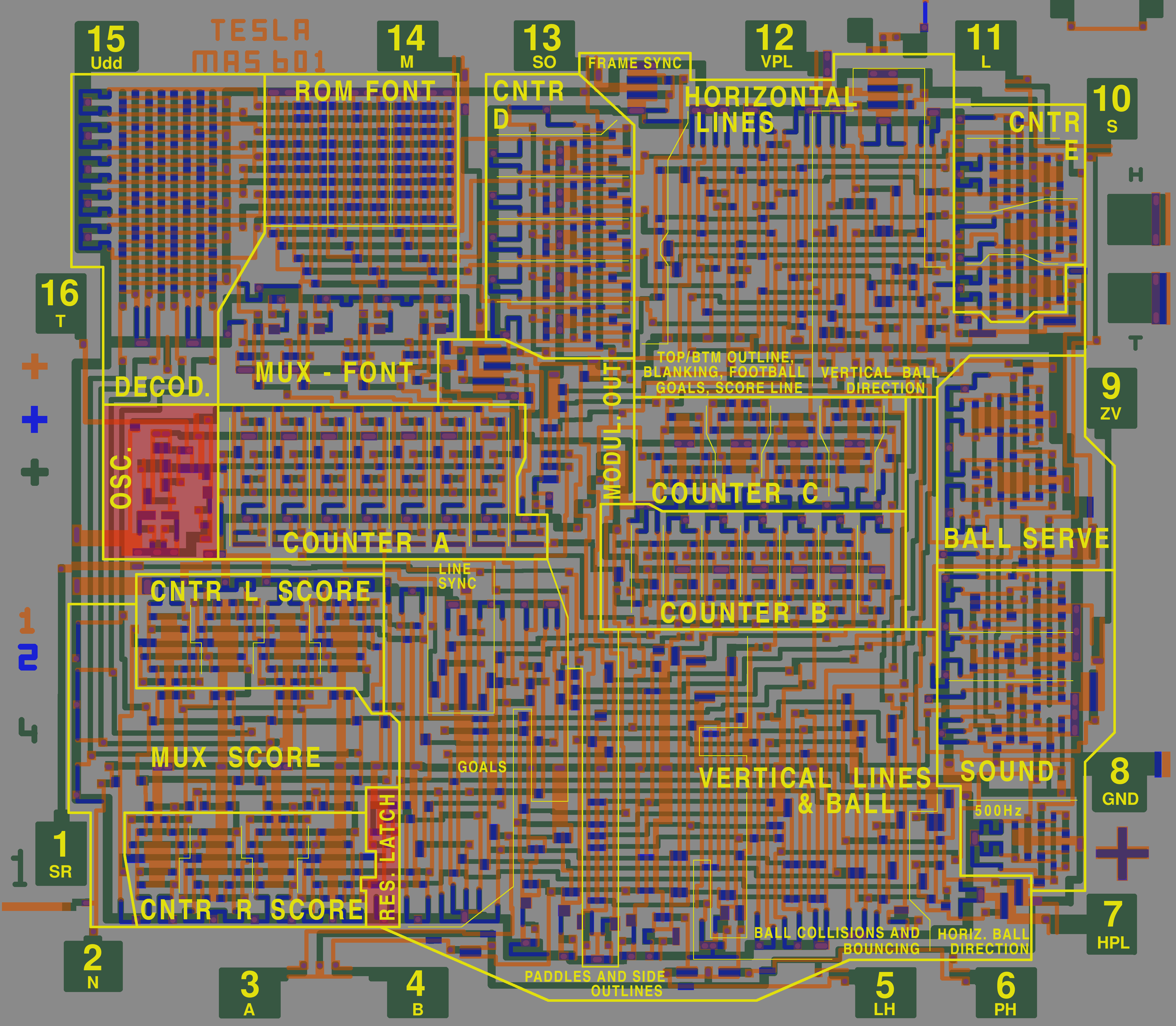 Tady se mimoděk dotýkáme otázek ze závěru minulého článku. Architektura celého systému dává mnohem větší smysl, jakmile si uvědomíme limity Tesly v sedmdesátých letech, kdy výroba unipolárních integrovaných obvodů teprve začínala. Zde použitá technologie MNOS stála někde u jejích začátků, byla původně zvolena především kvůli spolehlivosti při ne zcela ideální čistotě výroby, a v době vzniku MAS60x byla ještě prakticky jedinou volbou. Pro starší aplikace např. v ovládání televizorů (MAS560 atd.) se hodila dobře, ani poměrně velké záporné napájecí napětí nijak nevadilo, pro televizní hru však přece jen už byla určitým limitem rychlost (podle slov ing. Áče byl mezní kmitočet jen několik MHz). Hodinový kmitočet 875kHz použitý pro MAS601 poskytuje ve vodorovném směru rozlišení 39 pixelů, které by pro digitálně řešený pohyb míče zřejmě nebylo dostatečné. Uvážím-li navíc rozsah logiky potřebné pro takové řešení, a také velikost čipu, který jako by na úvodním obrázku již přetékal z podložky v pouzdře, nedivím se, že v části systému prozatím převážily výhody řešení typického pro starší analogové hry. S několika vnějšími součástkami a mnohem jednodušším obvodem se tak dosahuje skutečně plynulého, libovolně nastavitelného pohybu.