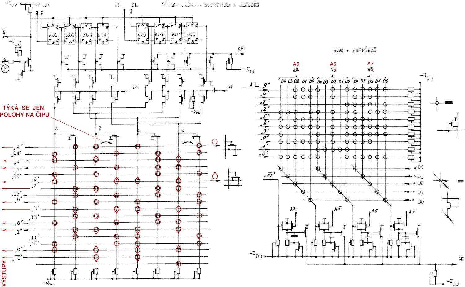Nyní již můžeme obvod začít převádět do podoby klasického schématu, je to však obvod poněkud nezvyklý - máme zde totiž jen samé tranzistory (plus ojediněle malý kondenzátor, tvořený obdélníčkem dvou vrstev na sobě). Jak bylo v 70. letech obvyklé, jsou všechny tranzistory stejného typu vodivosti, v tomto případě P (otvírají se při záporném napětí hradla, odtud tedy i záporné napájecí napětí celého systému). Zapojení pak odpovídá logice P-MOS, kde většinou různé kombinace tranzistorů (podle logické funkce) spínají výstup do země, a pokud sepnuty nejsou, objeví se na výstupu napětí přivedené přes odpor (pull-up, nebo zde vzhledem k zápornému napětí možná spíše pull-down). Vznikal tím sice jistý trvalý odběr proudu a možná ne úplně ideální rychlost spínání, bylo však jednodušší tuto verzi vyrobit. (Později přišla technologie CMOS, která kombinuje oba druhy tranzistorů P+N k aktivnímu spínání signálů v obou polaritách.)